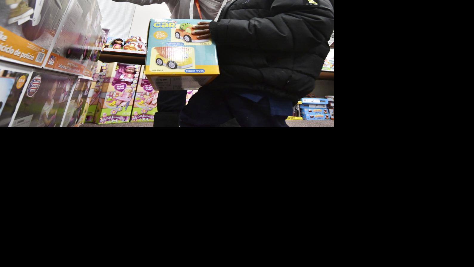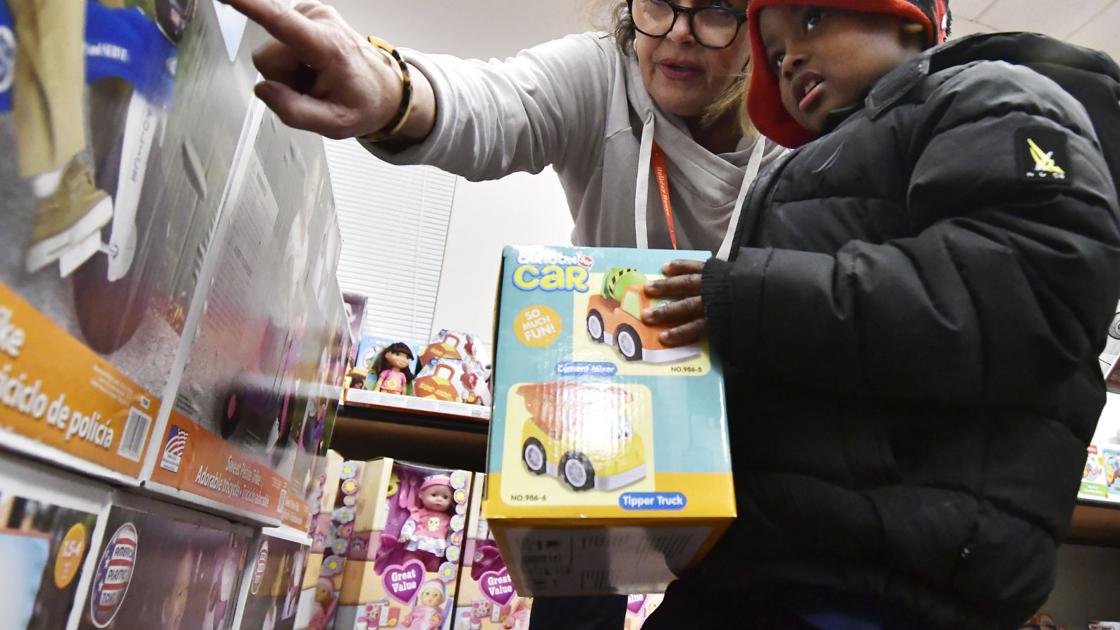 Jerome Pearson, 3, picks out toys with volunteer Ann Marie Venn during the Holiday House event in December 2019. Registration for this year’s Holiday Hosue events is now underway.