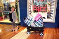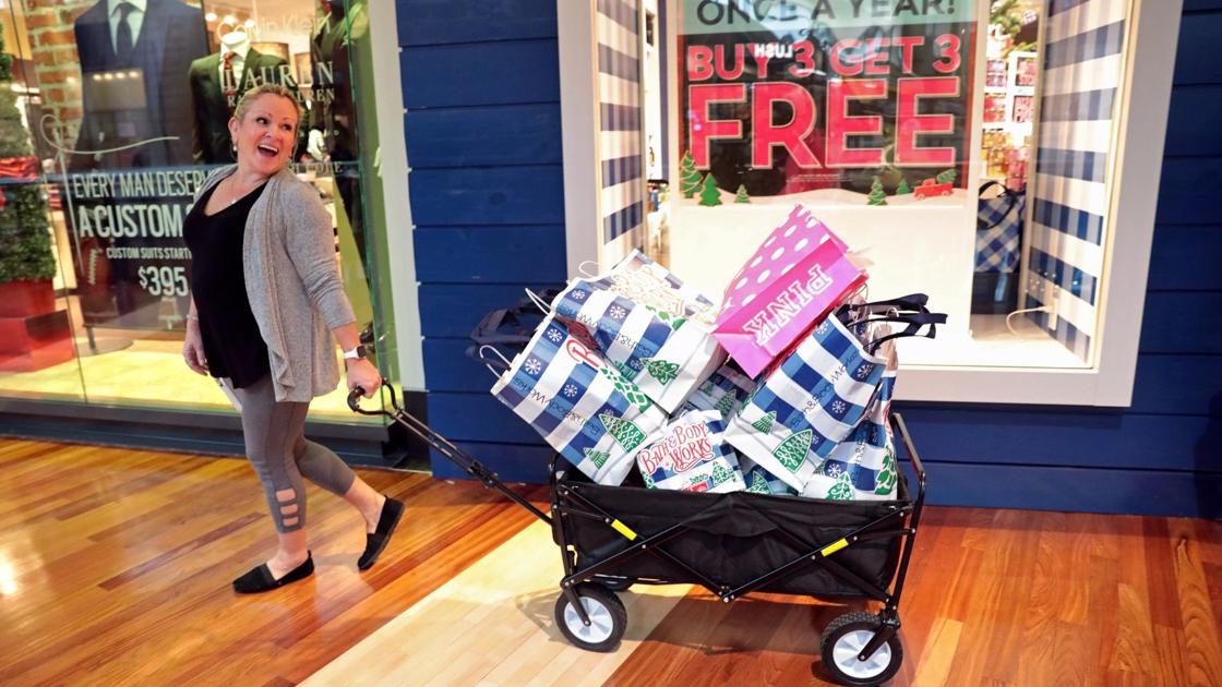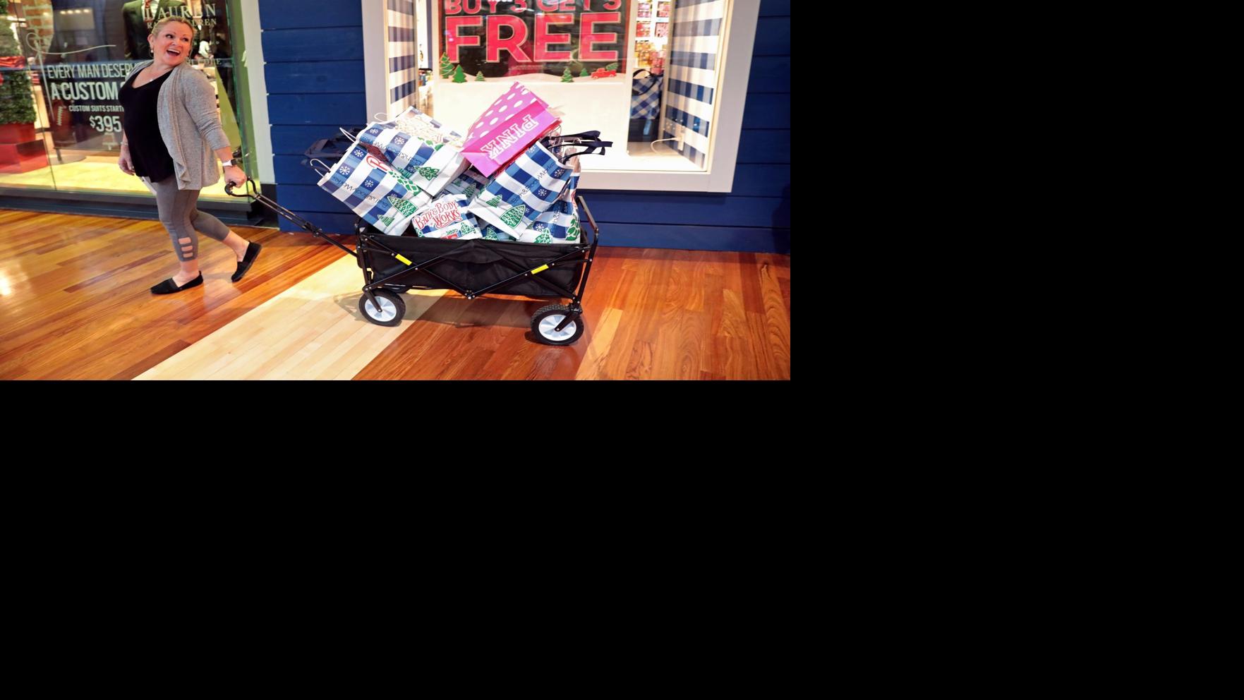 Mona Spiker, of De Soto, Mo., laughs as she hauls away her purchases during Black Friday at the West County Center in Des Peres on Friday, Nov. 29, 2019. She was shopping for family and coworkers. Photo by Cristina M. Fletes, cfletes@post-dispatch.com.