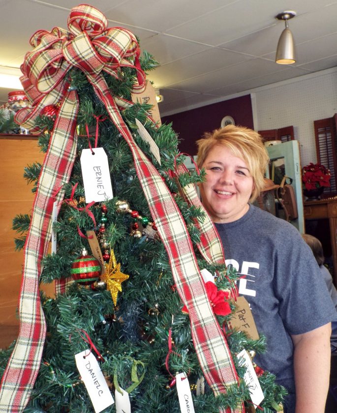 Lisa Smith, co-pastor of Grace City Church, stands next to an Adopt-A-Senior holiday tree, standing near the front of the Turquoise Tables’ store that benefits their outreach ministry. (Photo by Stephanie Ujhelyi)