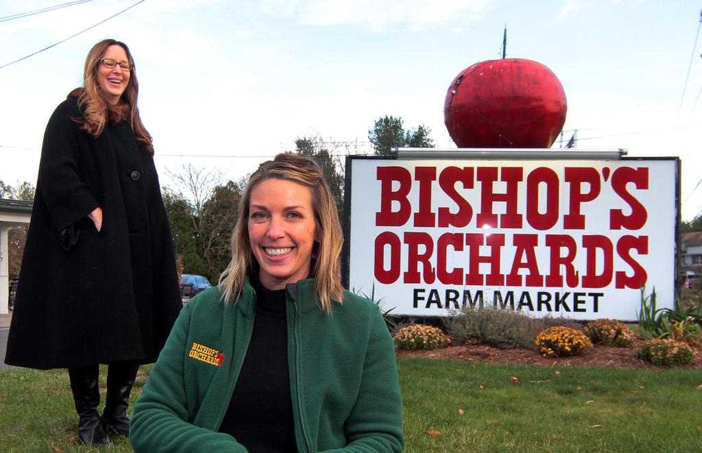 Nikki Rasmussen, left, who owns Little Whimsy Boutigue Bakery, and is the organizer of the first annual "A Holiday Market" artisan fair, poses with Sarah Bishop Della Ventura at Bishops Orchards Farm Market & Winery in Guilford, Conn., on Thursday Nov. 19, 20. The fair will be held at Bishops Orchards on Nov. 28.