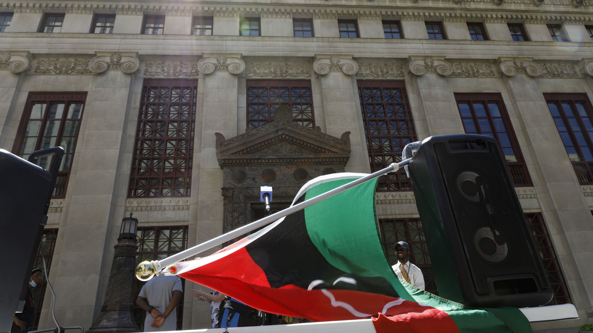 A Pan-African flag is draped over speakers at a press conference about Juneteenth held by DaVante Goins in front of the Columbus, Ohio city hall on June 17, 2021.